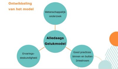 Driestroom is er voor mensen met een ondersteuningsvraag bij het realiseren van alledaags geluk. Dat doen we aan de hand van ons Alledaags Gelukmodel. Alledaags geluk ontstaat als je dingen doet die bij je passen en waarbij je jouw talenten kunt gebruiken. Ook is het belangrijk dat je op plekken komt waar je je fijn voelt en omringd bent met mensen die belangrijk voor jou zijn.