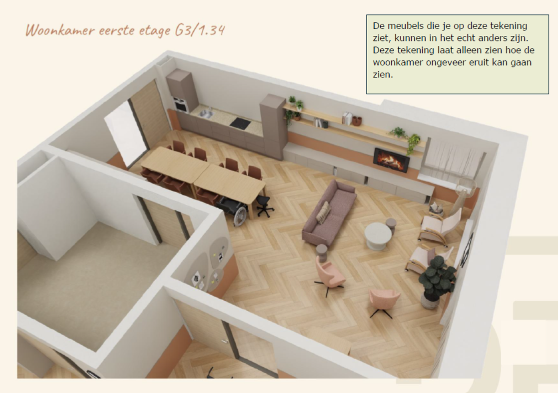 In het nieuwe gebouw is ruimte voor 50 bewoners. Op de eerste en tweede verdieping komen studio’s met eigen sanitair en de gemeenschappelijke woonkamers. Op de begane grond komen vier (aanleun)woningen voor mensen die op meer afstand kunnen wonen. Zij krijgen bijvoorbeeld ook een eigen ingang.